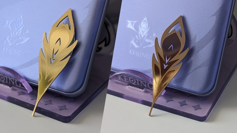 The box also includes a set of chibi stickers, a set of pinback buttons, and a Keqing-themed protective case for the phone. Also in the mix is a “Glinted Lightning” themed 100W SUPERVOOC power adapter, a “Glinted Lightning” themed fast charging cable, and a “Lightning Stiletto” style SIM ejector. This SIM card ejector tool is not one you’ll likely lose — no more using silly SIM card tool alternatives for you.