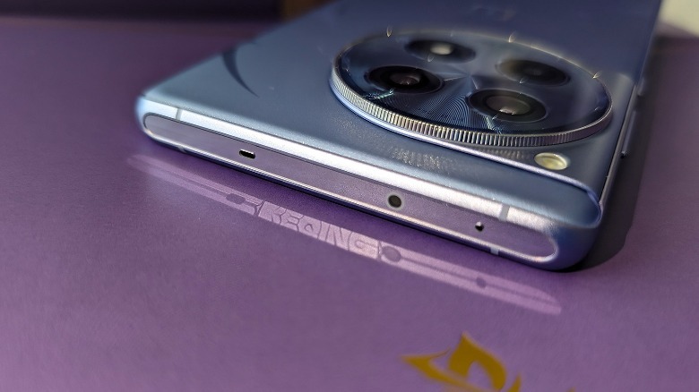 The OnePlus 12R itself comes in “Electro Violet” with elements inspired by the character Keqing — as you might guess, given the device’s packaging and promotional materials. In the center of the back of the phone is the OnePlus logo, and at the base of the back is an iteration of the graphics used to illustrate Keqing’s own Lightning Stiletto. More than one finish and reflective materials make for a visual experience that makes it difficult to want to use this device with a protective case covering its backside.